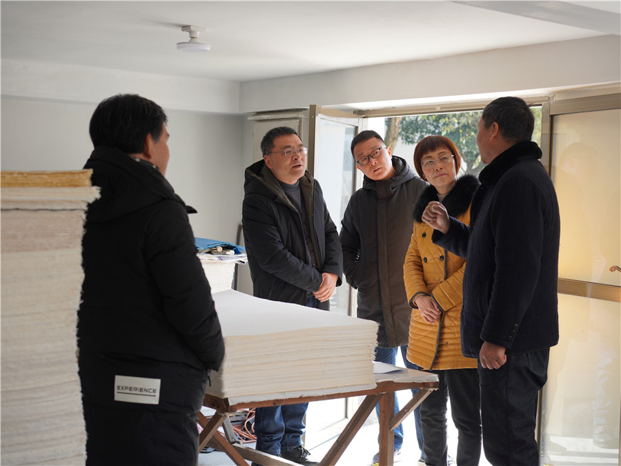 10月9日下午,縣長吳云忠赴海陽鎮(zhèn)凝霜文化發(fā)展公司調(diào)研徽州楮皮紙傳承與發(fā)展工作,縣委常委、海陽鎮(zhèn)黨委書記金學(xué)年,縣委常委、縣政府副縣長程衛(wèi)華參加調(diào)研活動(dòng)。 吳云忠一行實(shí)地察看了徽州楮皮紙生產(chǎn)工藝流程,認(rèn)真聽取企業(yè)負(fù)責(zé)人介紹,詳細(xì)詢問徽州楮皮紙制作工藝